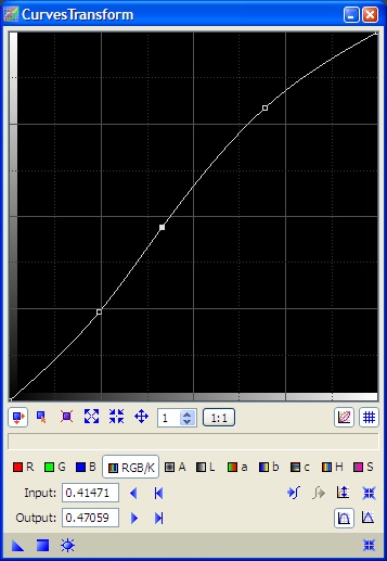 Thanks to this second HDRWT instance we can enrich our vision of this object: by flattening the image at small scales, a simple curves adjustment can reveal all structures at the same time, from those that were poorly contrasted in the original image, to small features that were close to saturation. The relatively smooth transfer curve that we have applied can be seen on Figure 8.