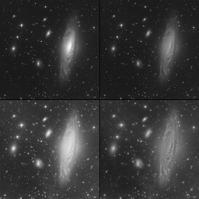 Figure 18 (right)— The entire wavelets processing. Upper-left: The nonlinear image before wavelets processing; Upper-right: After the initial dynamic range compression with HDRWT; Bottom-left: Stretched HDRWT result; Bottom-right: Result of combining the stretched HDRWT image with large-scale and small-scale structures processed separately.