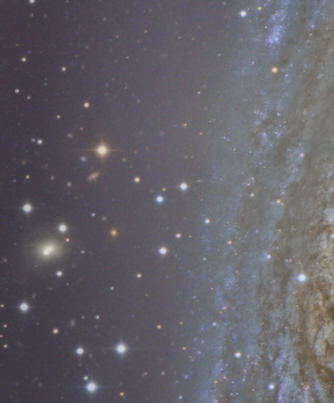 On the other hand, to achieve the maximum color deepness it is mandatory to collect all the light through color filters. Noise exists at all scales: from 1 pixel to 64 pixels; our image is not entirely significant data at any dimensional scale. This is especially true when you want to raise structures of extremely low surface brightness. These structures can sometimes have also very mutted colors. In this scenario, the LRGB method is very problematic because each time we are acquiring only luminance we are losing color information in the final result. Not only luminance must go deep: color information must be present throughout the entire image. And even more important: color data must be able to fully support luminance data. As you can see in my image, all pixels and all image structures carry significant color information.