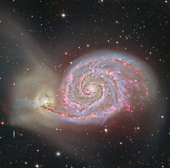 The gaseous content of colliding galaxies gets compressed and this triggers violent bursts of star formation (starbursts). Star forming regions can be detected thanks to the pinkish glow of ionized hydrogen. Images taken in the so-called H-α color reveal where the gas is ionized by newborn stars. For this reason, we offer the M51 image in two versions: true color and H-α enhanced.