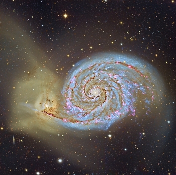 M51 and its companion are performing a cosmic dance that, during the last 500 million years has made NGC 5195 pass twice through the disk of M51. Now, the small galaxy is located slightly behind the disc of the Whirlpool, and moving away from us.