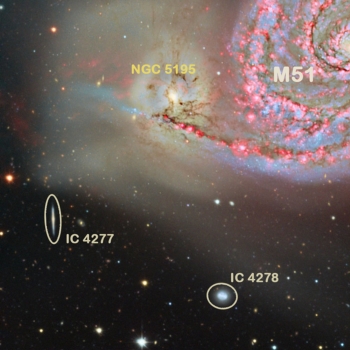 Many of the tiny points in the image are stars belonging to our own Galaxy. But a detailed inspection reveals that most of the small spots are other background galaxies. Small and remote extragalactic systems, of many shapes and colors, can be seen down to the edge of infinity in this photo. The two most outstanding background galaxies are the bright edge-on spiral galaxy IC 4277 seen close to the lower left (north-east) corner of the frame, and the small irregular galaxy IC 4278, to the right of the previous one, below (east) from the bridge of stars that seems to link M51 with NGC 5195.