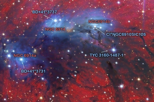 This photo of NGC 6914 released by Descubre Foundation, in collaboration with the Documentary School of Astrophotography (DSA) and the Astronomical Observatory of the University of Valencia (OAUV), captures this area of star formation in all its beauty. The collection of gas and dust in this image shows three main bright areas known as NGC 6914 (at the center), NGC 6914a (to the south, at left in the image) and NGC 6914b (to the north, at right in the image). Each bright nebula nucleus is centered on one or more massive, young hot stars. Some of these stars can be seen through small telescopes; but to discern details in the nebulae, a dark sky and a large aperture are really needed.